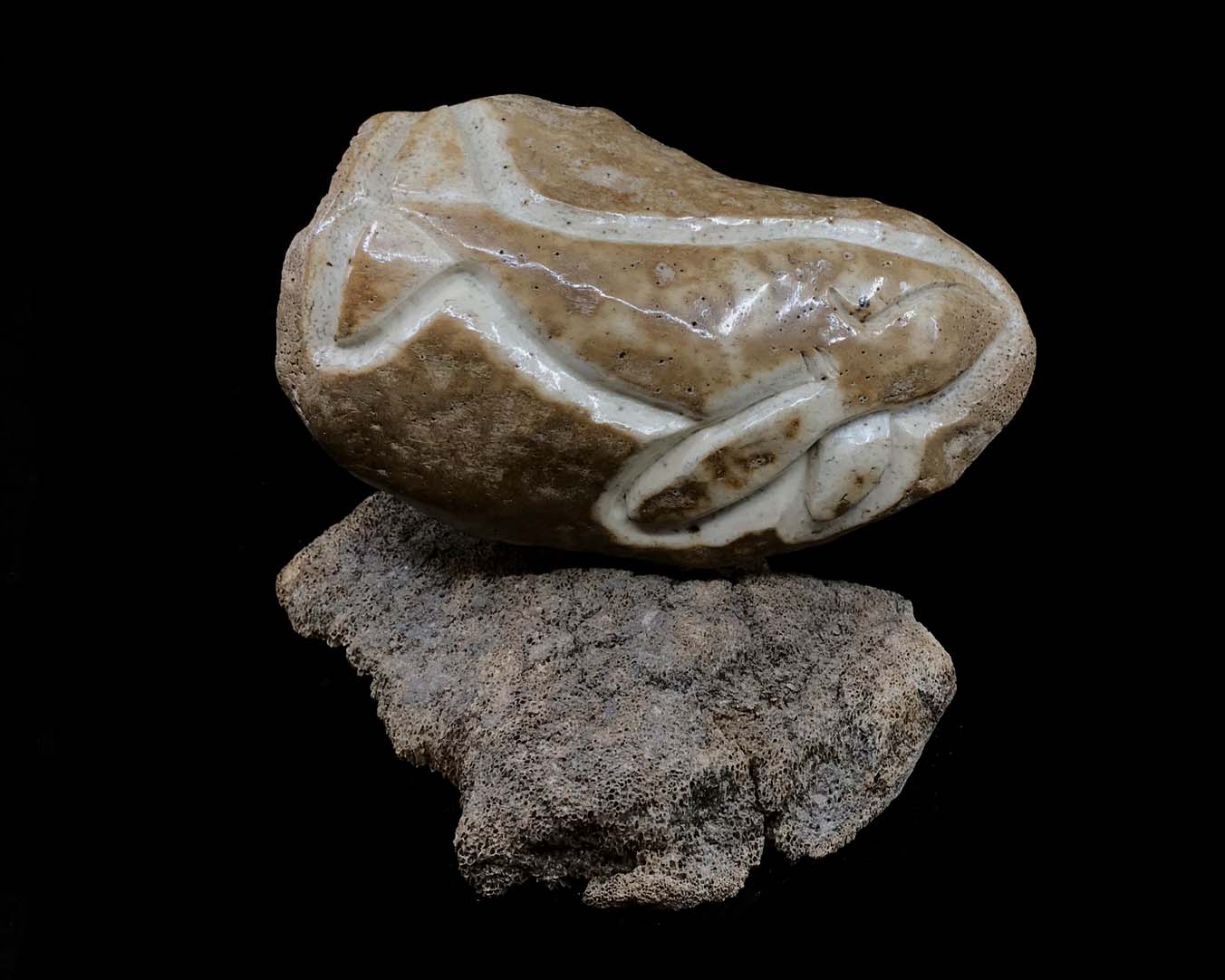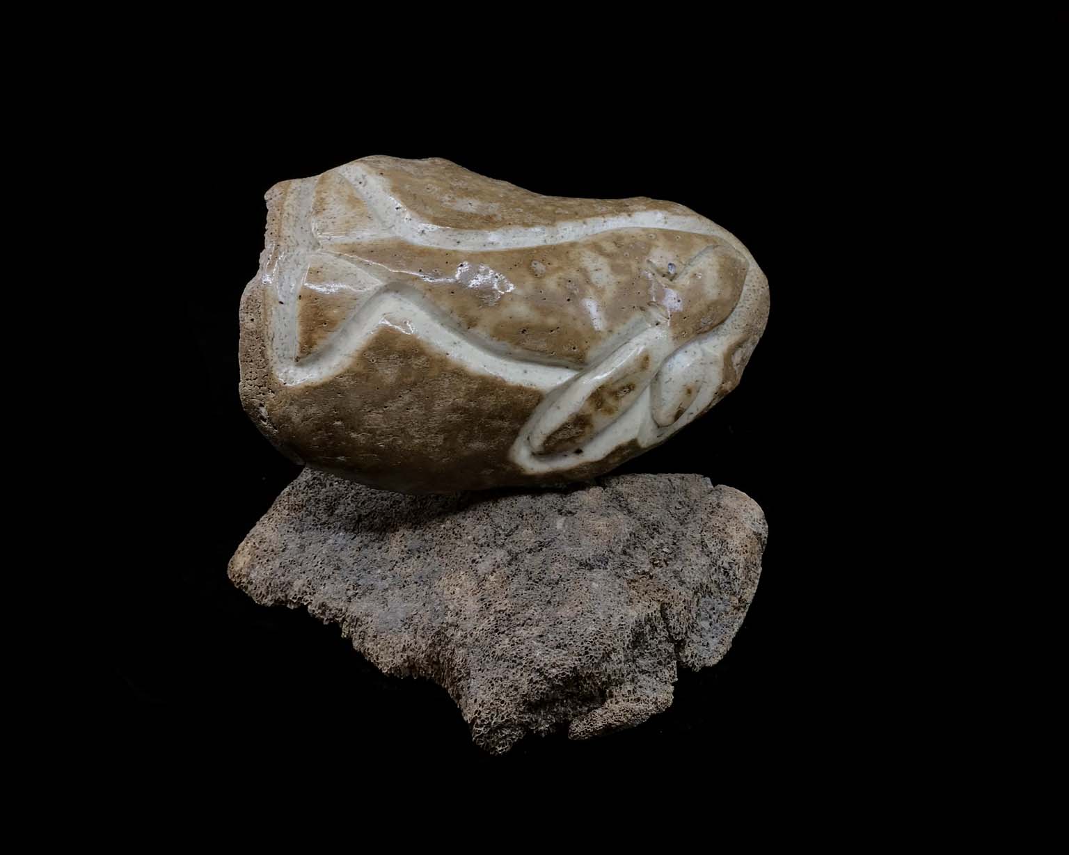 Hand carved whale cheekbone featuring a bowhead whale design with baleen inlay eye and mounted on a porous piece of whalebone signed JDG