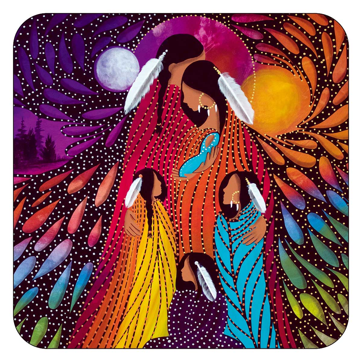 Family, by artist Betty Albert. Her cultural background is Cree. The artist is paid a royalty on every sale.