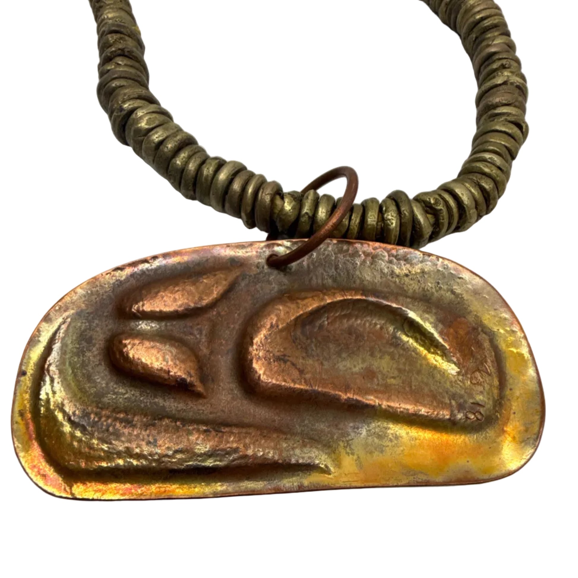 Salmon Trout Head medallion, engraved, chased and repoussé in copper, and strung with metal brass trade beads handmade by Tlingit artist Jerrod Galanin of Sitka, Alaska