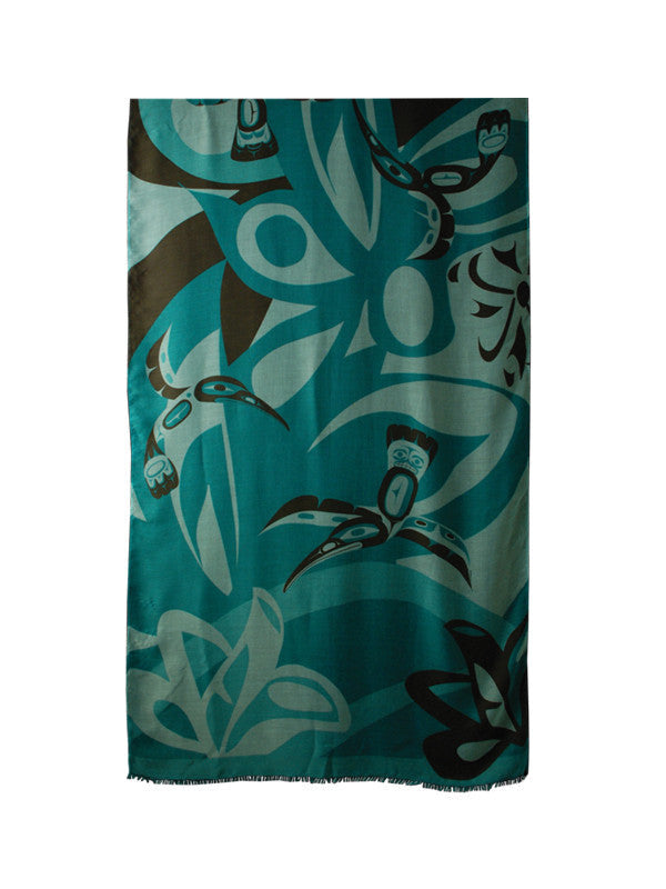 Beautiful Poly Woven Shawl with Hummingbird design by artist Andrew Williams. Available in red ot turquoise.