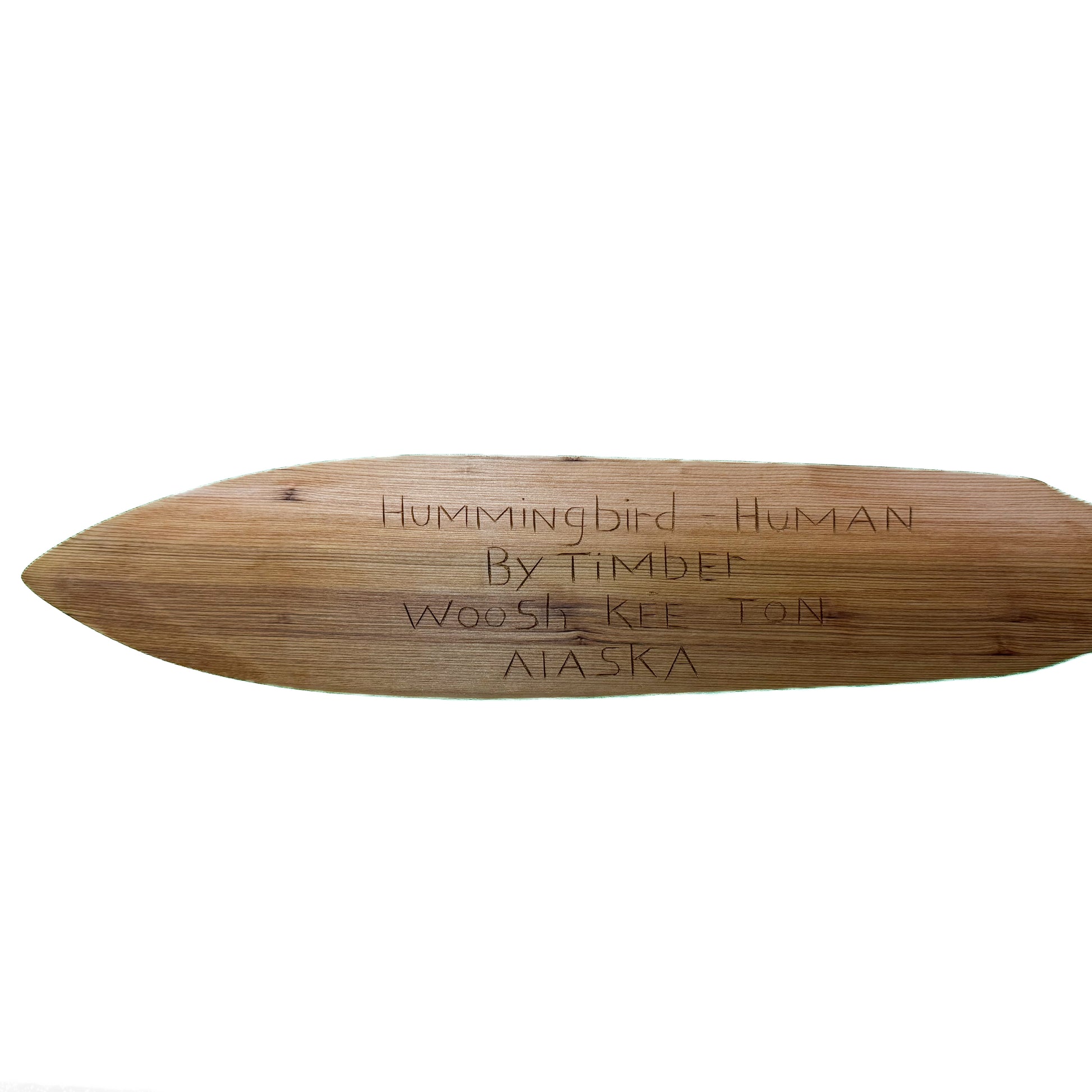 Experience the traditional art of the Tlingit people with this carved and painted copper inlay red cedar paddle featuring a Hummingbird and Human design created by Tlingit/Athabascan artist Timber Vavalis of Palmer, Alaska